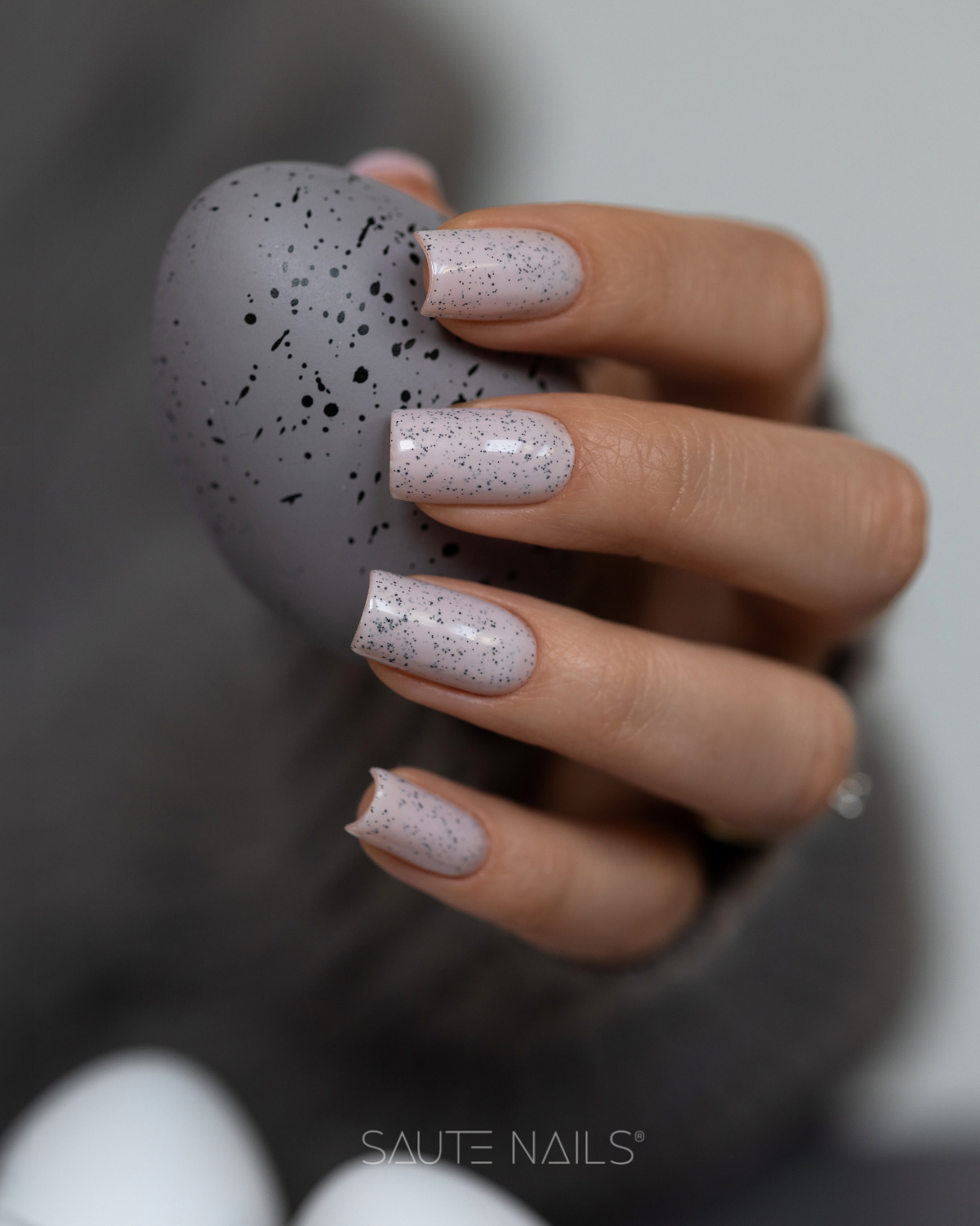 Esta coleção primaveril é composta por vernizes gel UV em tons pastel, com um acabamento distintivo marcado por pequenas partículas pretas.