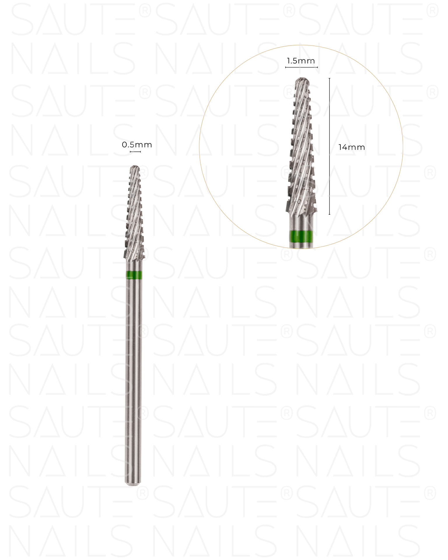 O comprimento da parte funcional da broca é de 14 mm, permitindo manobrar confortavelmente a ferramenta na parte inferior da unha e em outras áreas de difícil acesso.