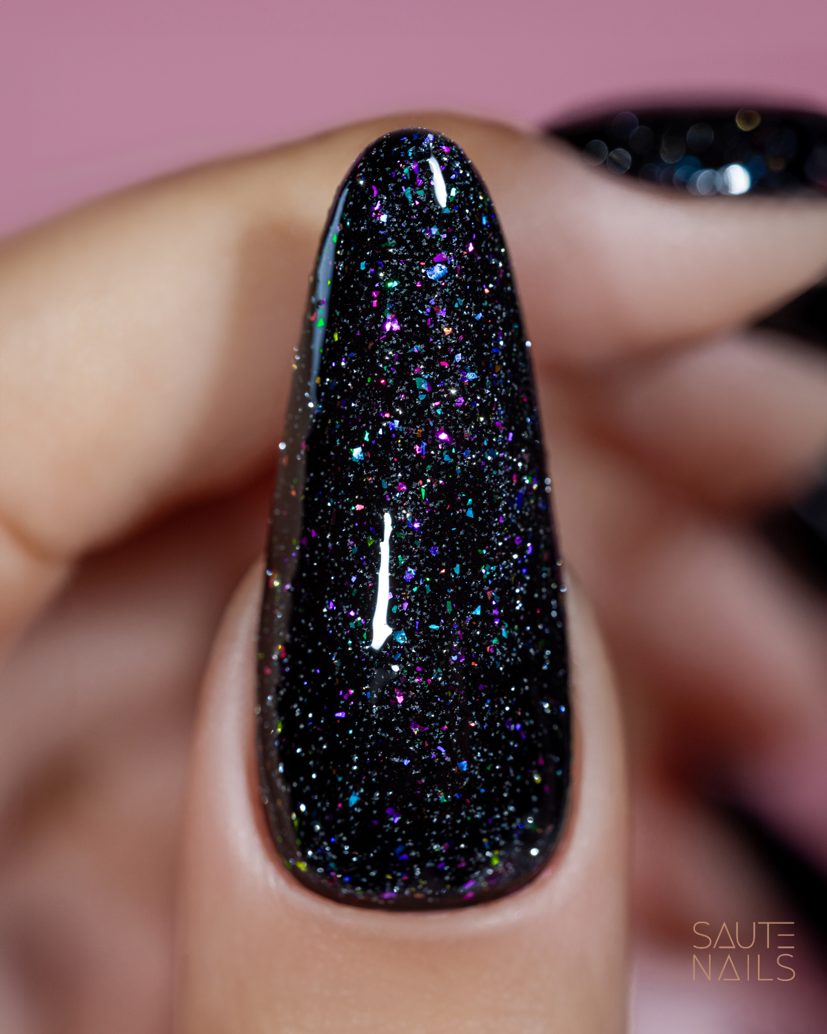 As partículas prateadas contidas neste top coat lembram pequenos pedaços de espelho, refletindo a luz e cintilando em cores do arco-íris a cada movimento.