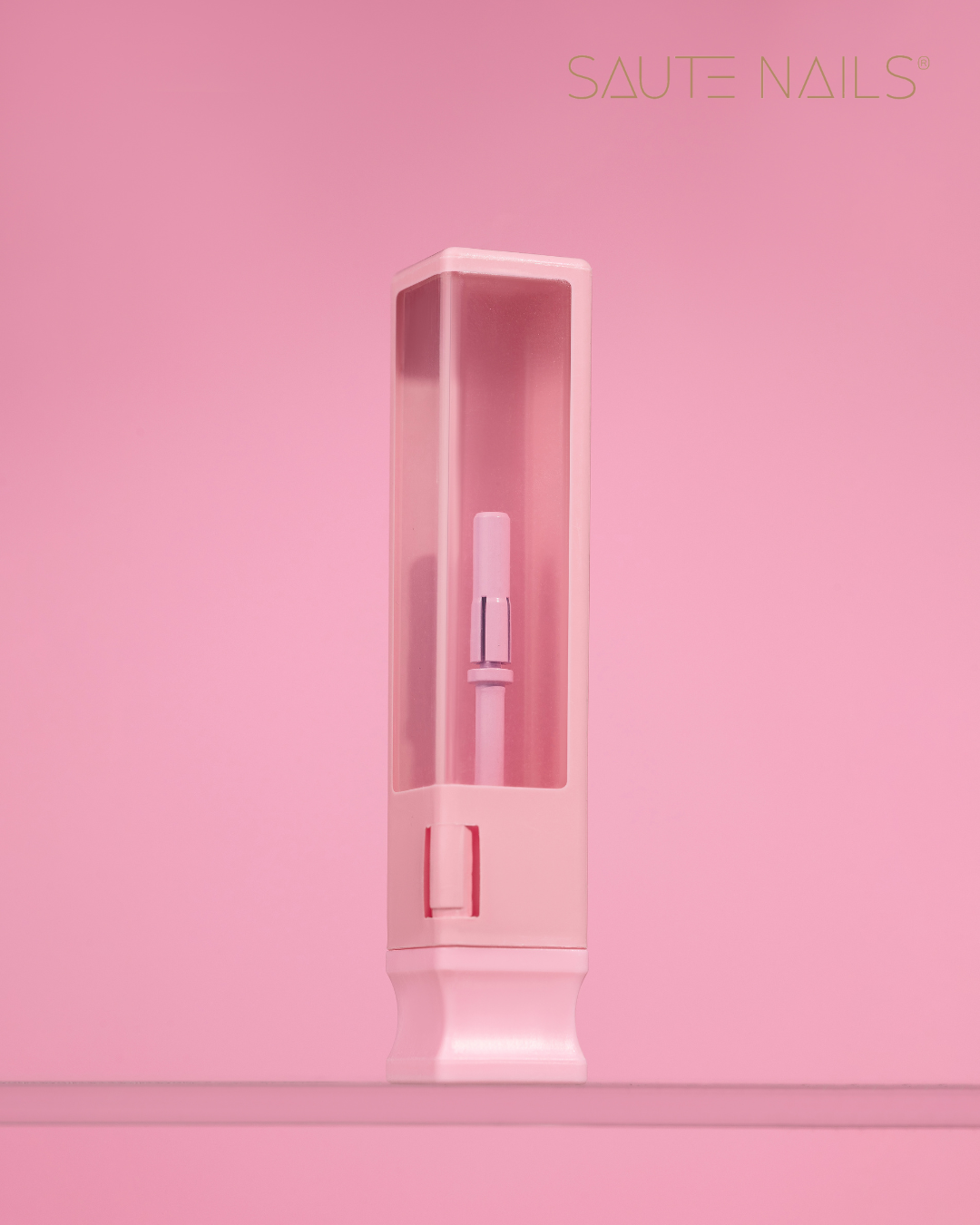 O mandril é feito em uma delicada cor rosa, adicionando um toque estético às ferramentas usadas no salão de design de unhas.