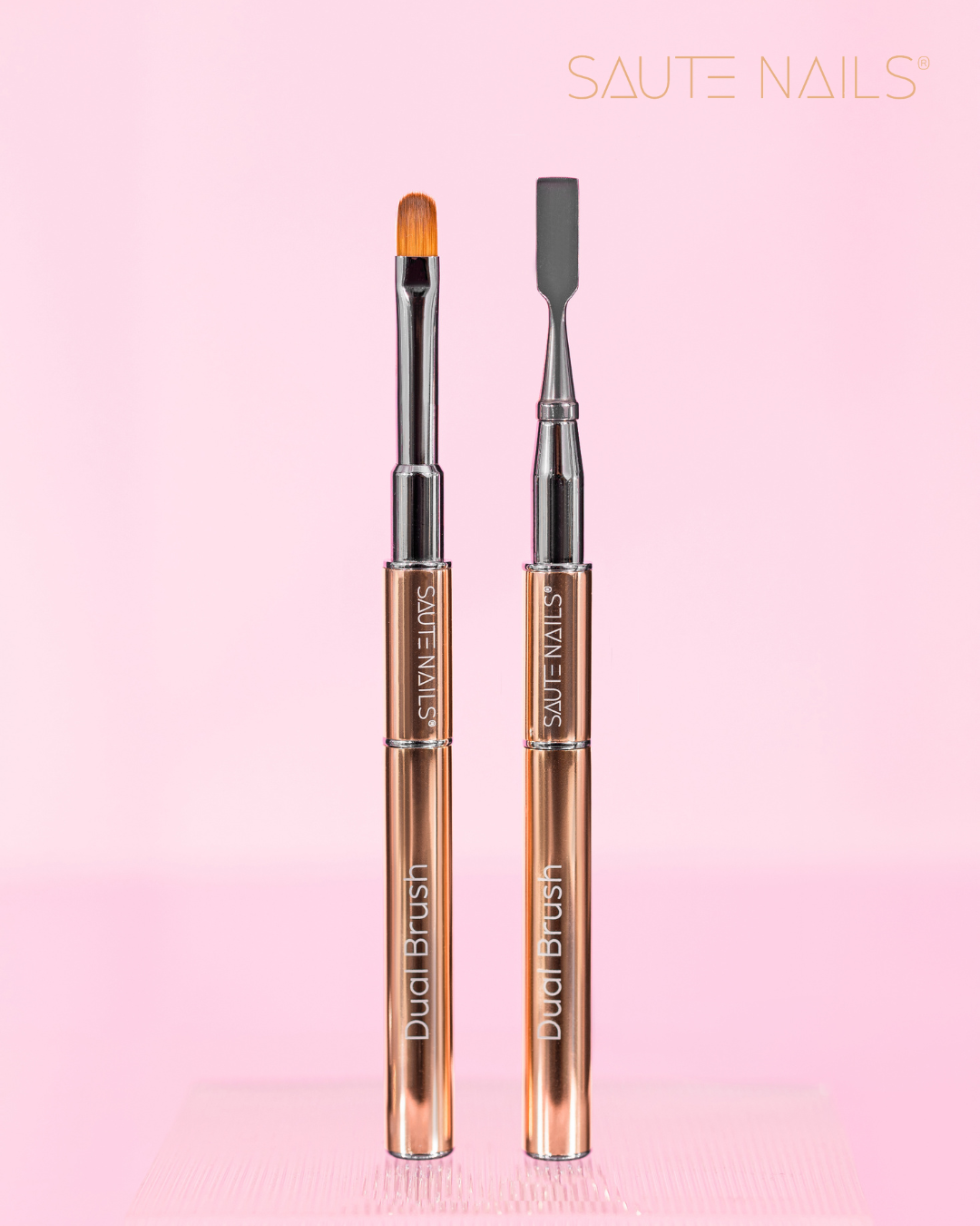 O pincel duplo Dual Brush é o duo perfeito para trabalhar com sistemas de acrílico em gel! Design em tons de ouro rosa que conquistará o coração de qualquer amante da estética.